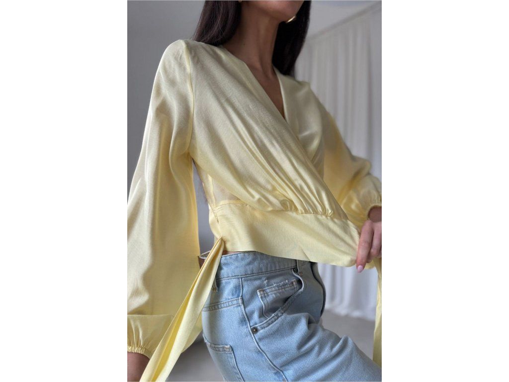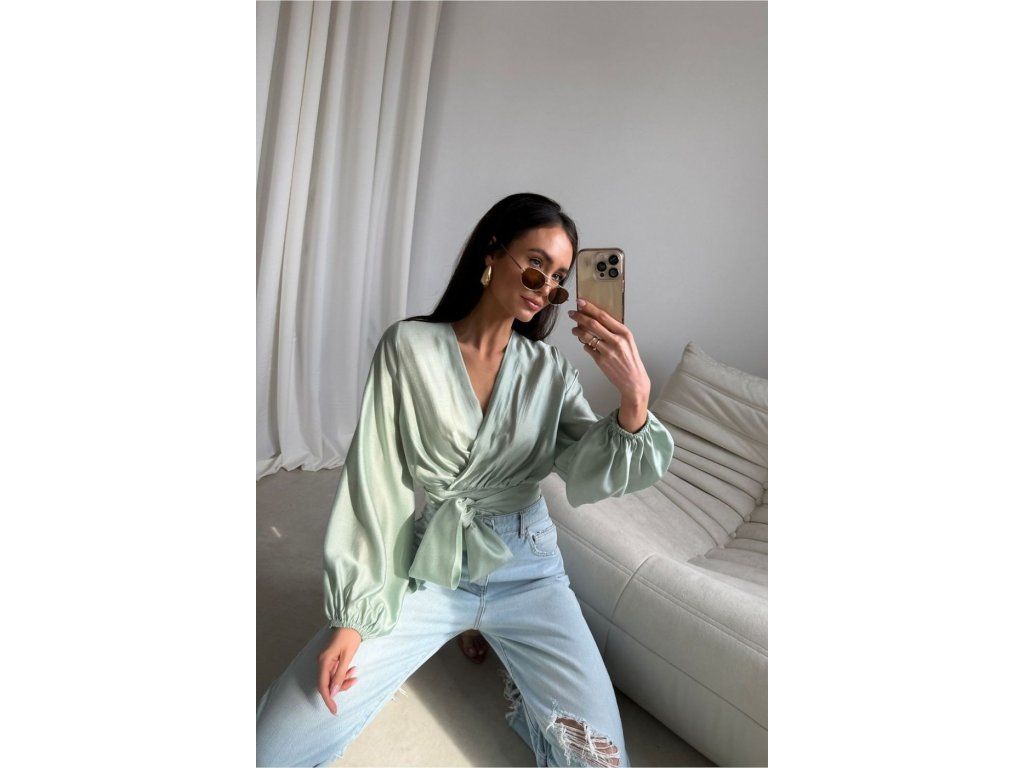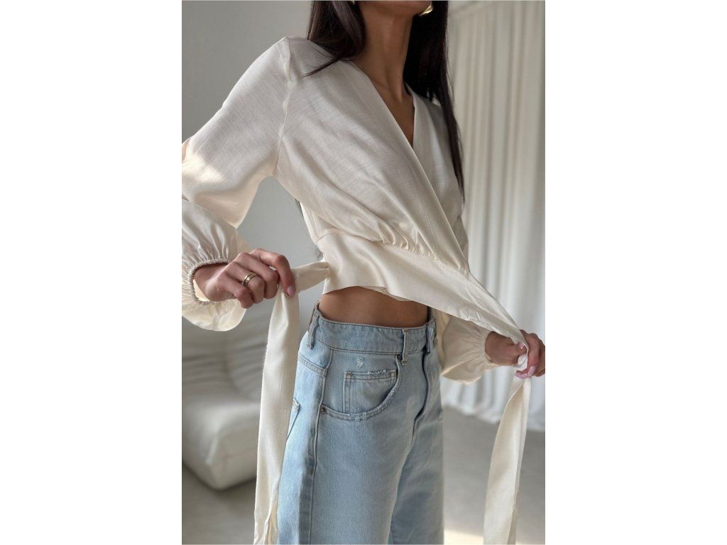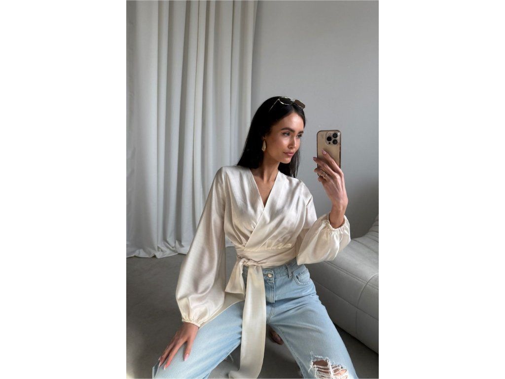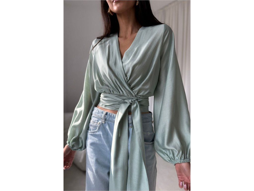 Blúzka vyniká svojím rafinovaným zavinovacím strihom a padavým materiálom s jemným hodvábnym leskom, ktorý dodáva celému outfitu luxusný nádych.