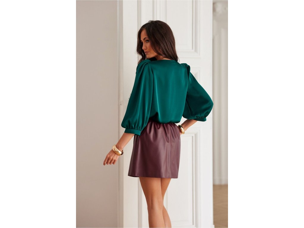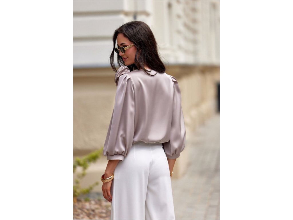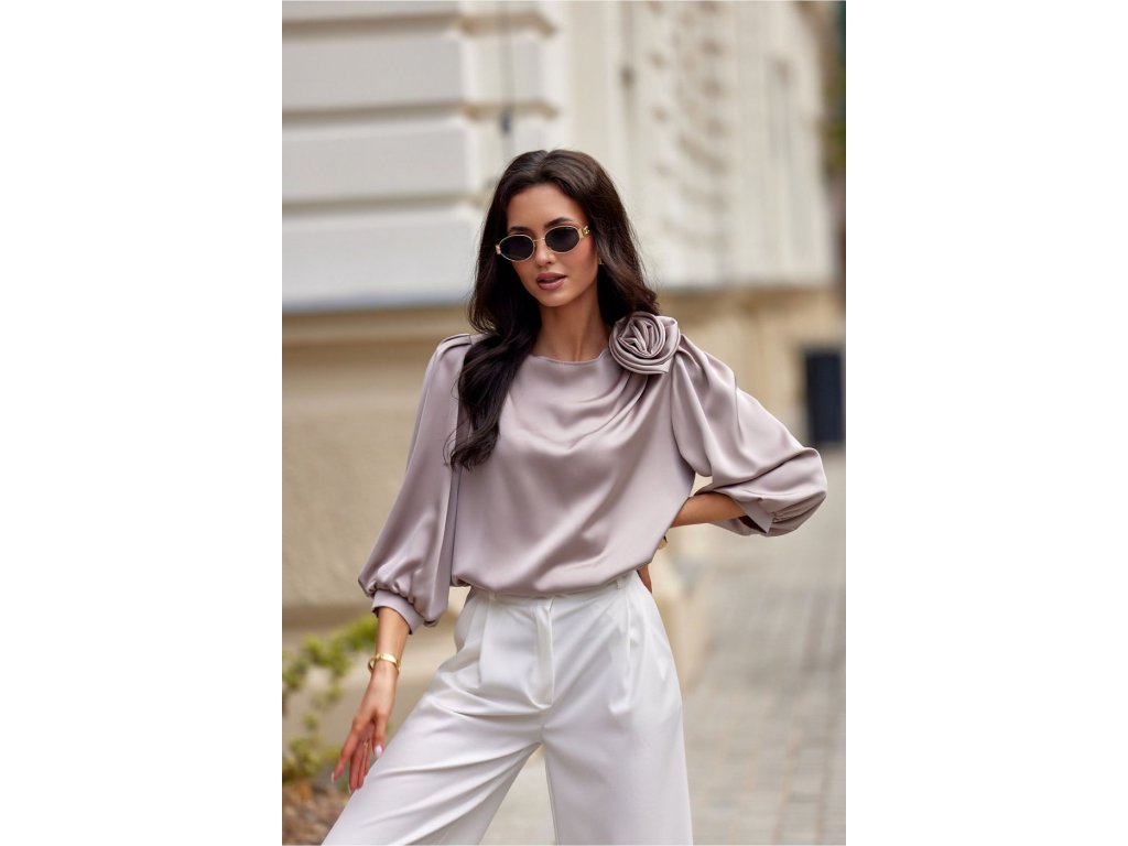 Model Giana je blúzka vyrobená z elegantného, saténového materiálu. Okrúhly výstrih blúzky ozdobuje efektná ruža, ktorá dodáva triedy a elegancie a robí blúzku veľmi originálnou. Široké, nafúknuté rukávy dlhé 3/4 krásne zdôrazňujú ramená a ženskú siluetu.