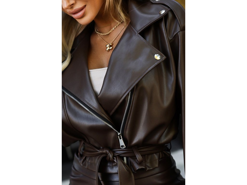 Štýlová bunda vyrobená z mäkkej, príjemnej na dotyk ekokože. Kratší, voľný strih krásne podčiarkuje pás, a asymetrický zips a opasok jej dodávajú moderný, mestský charakter. Od každodenných lookov po večerné štylizácie.