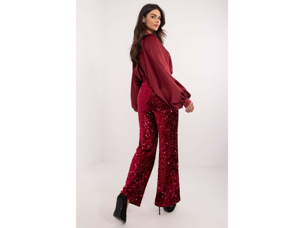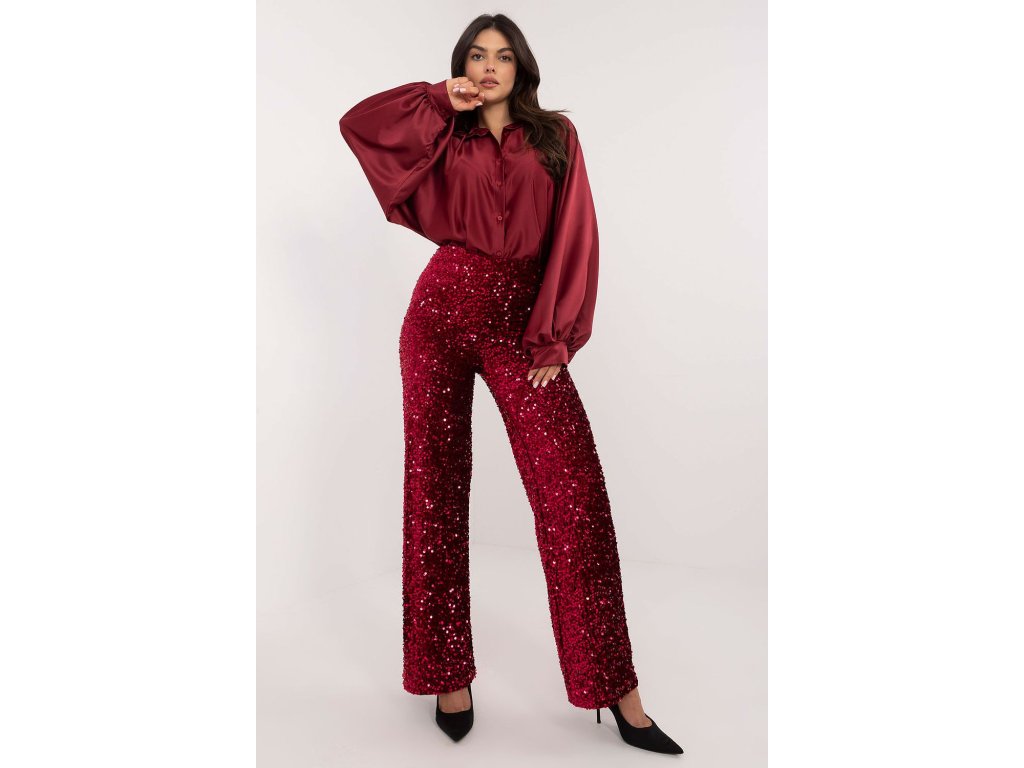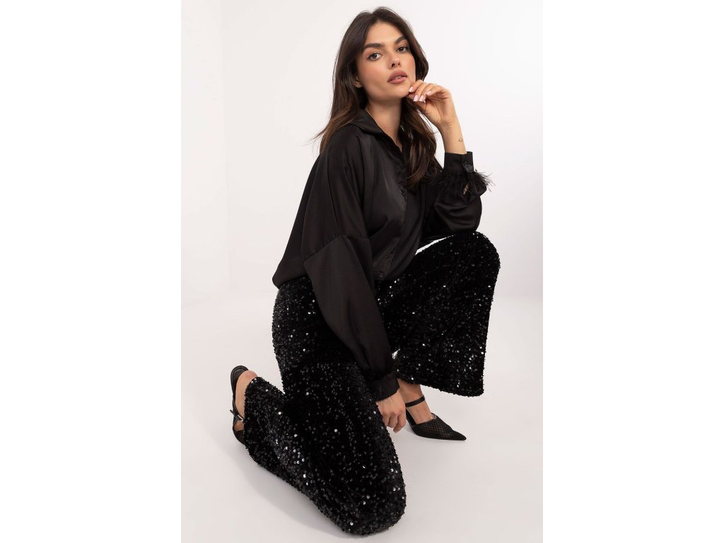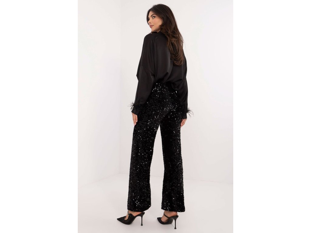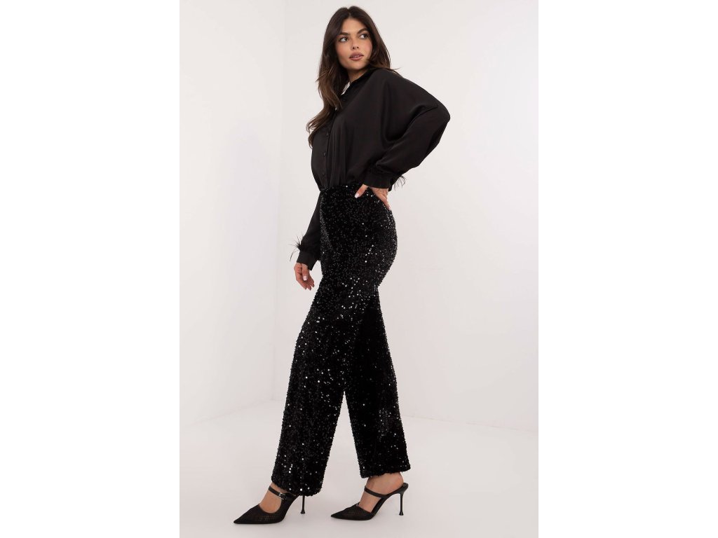 Elegantné materiálové nohavice s flitrami, navrhnuté na výnimočné príležitosti, ako sú spoločenské výstupy a párty. Vyrobené z kombinácie polyesteru a elastanu, nohavice zabezpečujú pohodlné prispôsobenie a jemný lesk vďaka aplikácii flitrov.