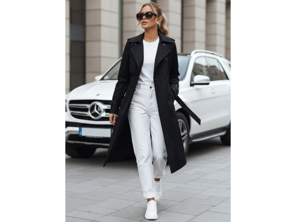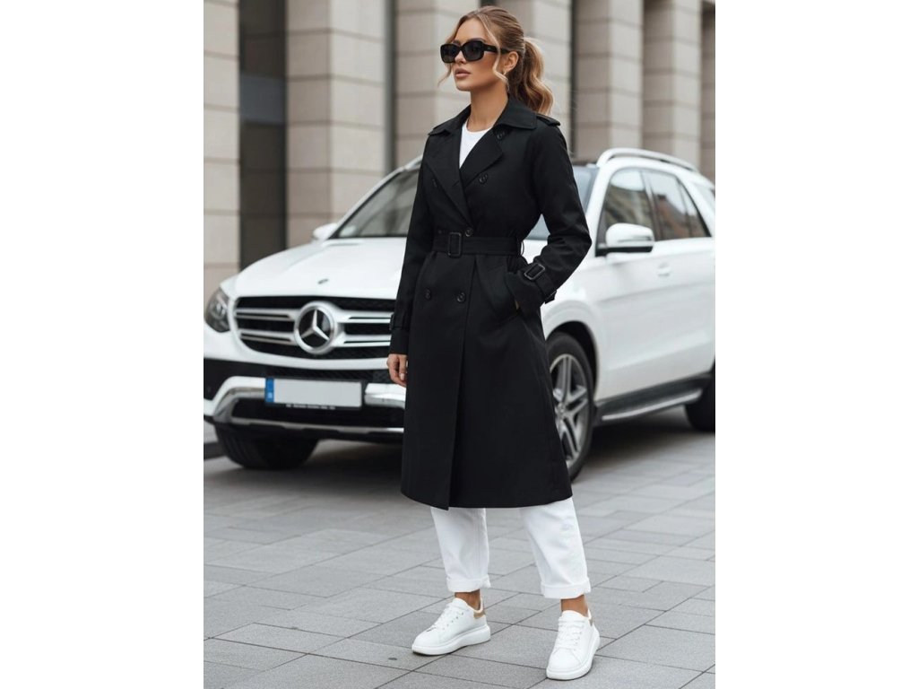 Dokonalý strih: Dvojradové zapínanie a opasok v páse krásne definujú ženskú siluetu a dodávajú postave štruktúru.