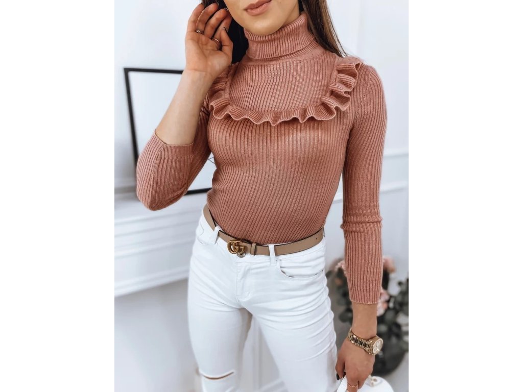 Zamiluj sa do ženskosti ukrytej v jednoduchosti! Tento rebrovaný sveter s volánovým detailom je dokonalým spojením pohodlia a štýlu. Vyrobený z mäkkého, pružného materiálu krásne obopne postavu a zvýrazní ženské krivky. Jemný volán pozdĺž výstrihu a stojačika dodáva outfitu romantický a elegantný nádych.