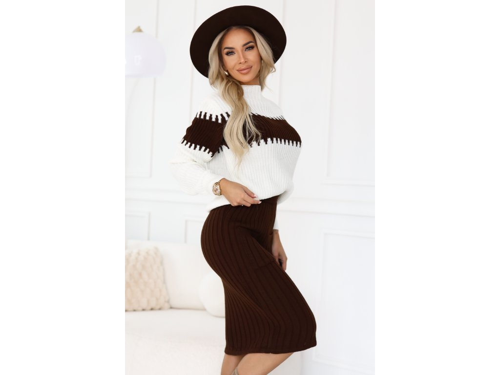 Elegantný svetrový komplet v čokoládovej farbe je ideálnou kombináciou pohodlia a štýlu. Dvojdielny set sa skladá z priliehavej, rebrovanej sukne s praktickými vreckami a mäkkého svetra voľnejšieho strihu, ktorý je možné nosiť ako klasicky, tak mierne uvoľnene. Vyrobený z vysoko kvalitného úpletu zaisťuje pohodlie nosenia a krásne sa układá na postave.