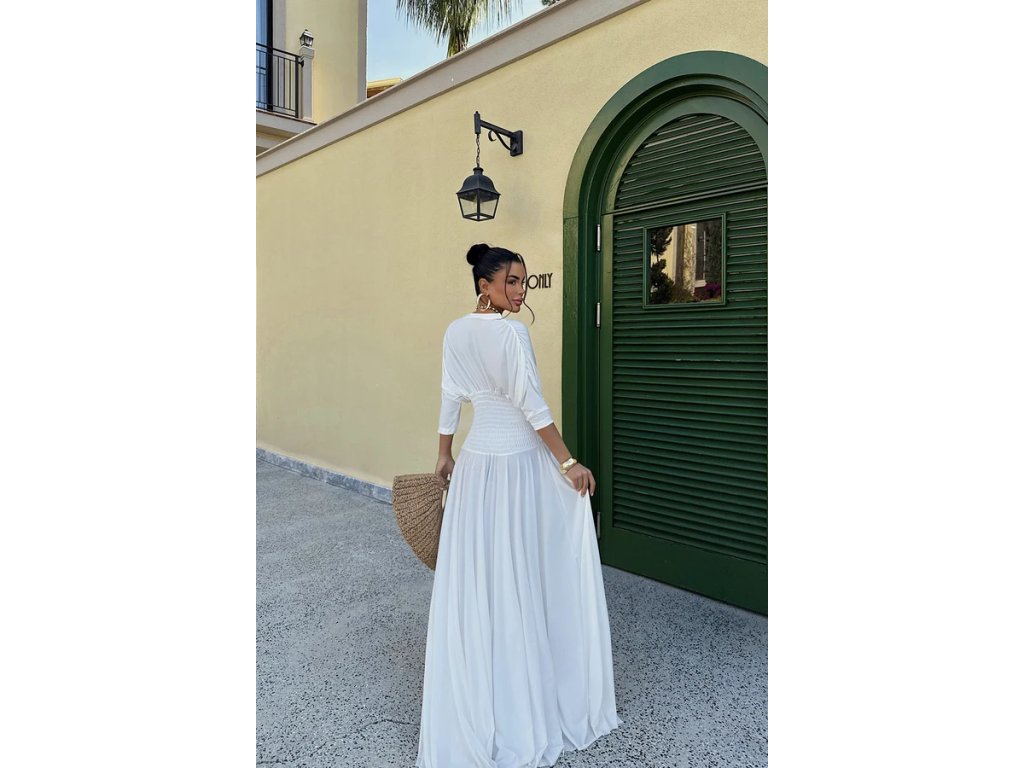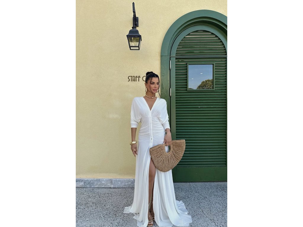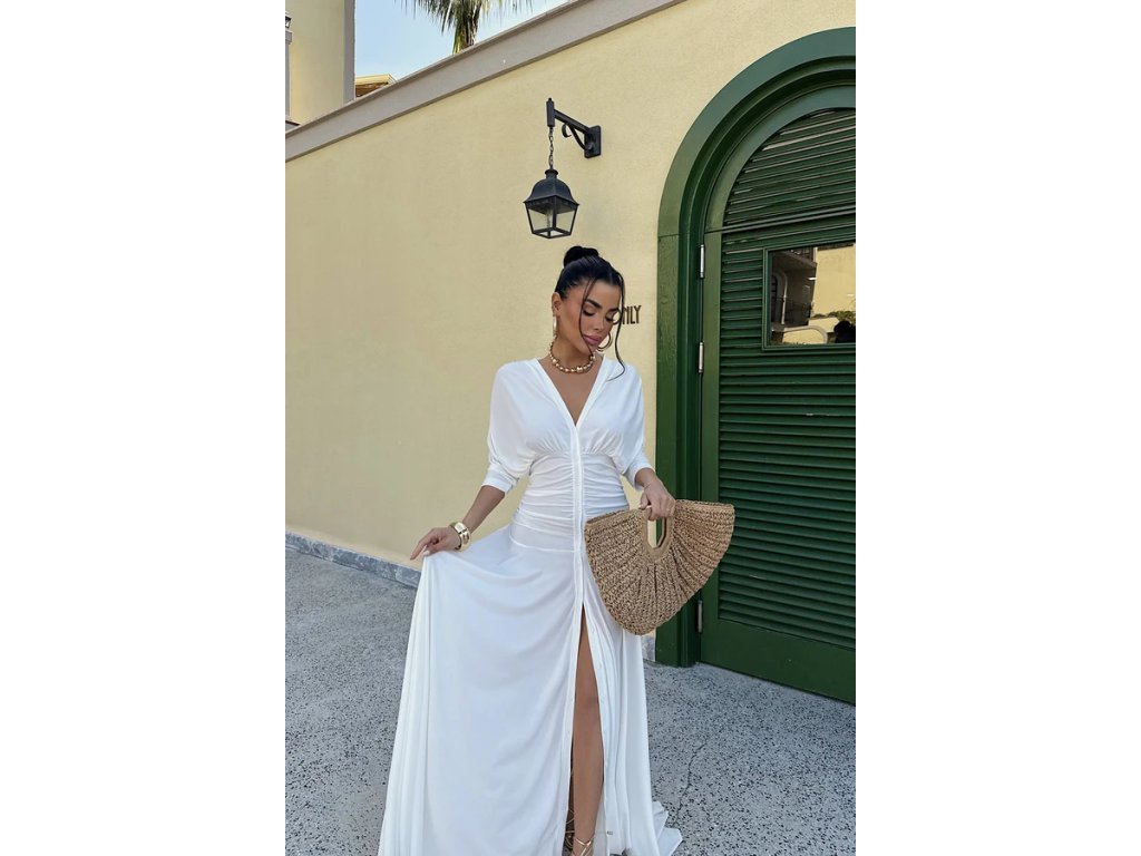 Dodajte svojmu šatníku nádych štýlu so šatami Portofino – modelom, ktorý spája rafinovanú jednoduchosť s plnou ženskosťou. Sú vyrobené z mäkkého, splývavého materiálu v odtieni čisto bielej a vďaka riaseniu v páse a rozparku odhaľujúcemu nohy dokonale zvýrazňujú siluetu.