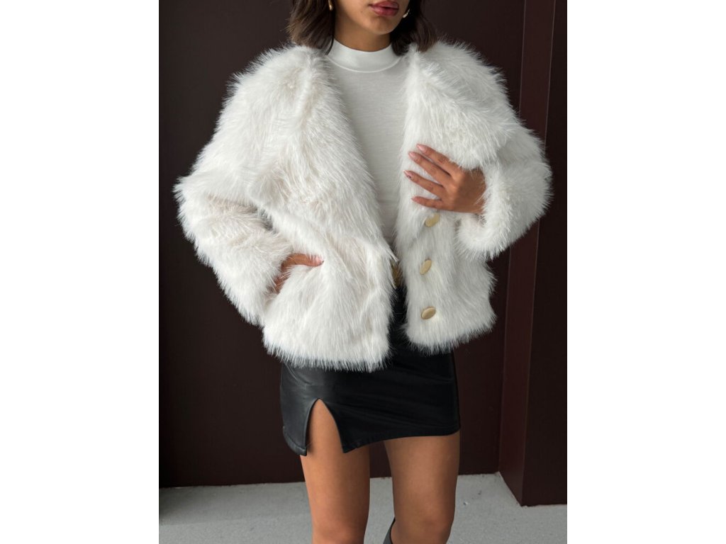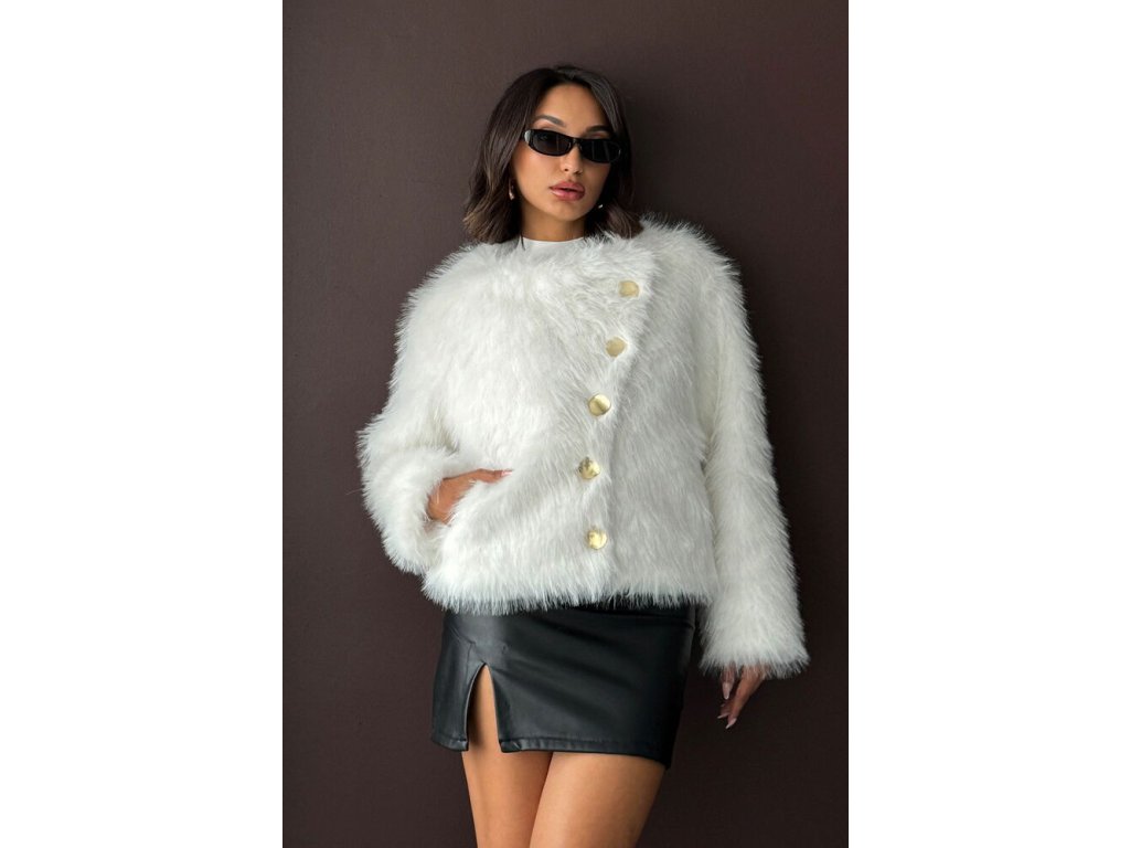 Štýlový Dizajn: Ozdobné veľké zlaté gombíky slúžia nielen ako praktické zapínanie, ale aj ako výrazný, luxusný detail, ktorý dodáva bunde punc výnimočnosti. Asymetrické zapínanie (viditeľné na bielom variante) pôsobí moderne a šik.