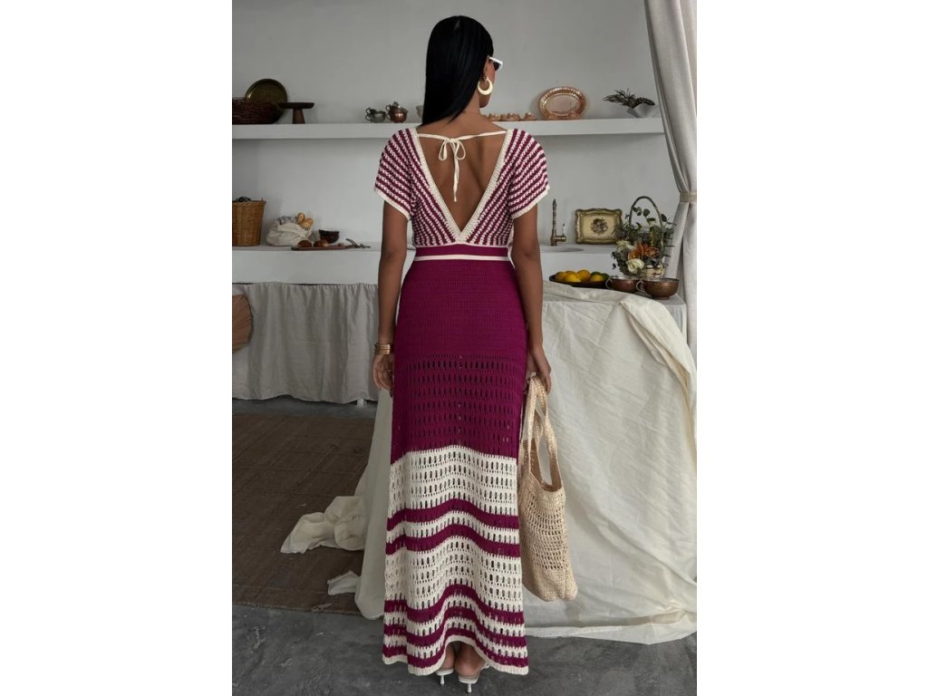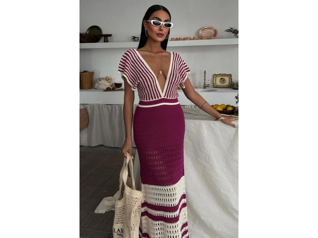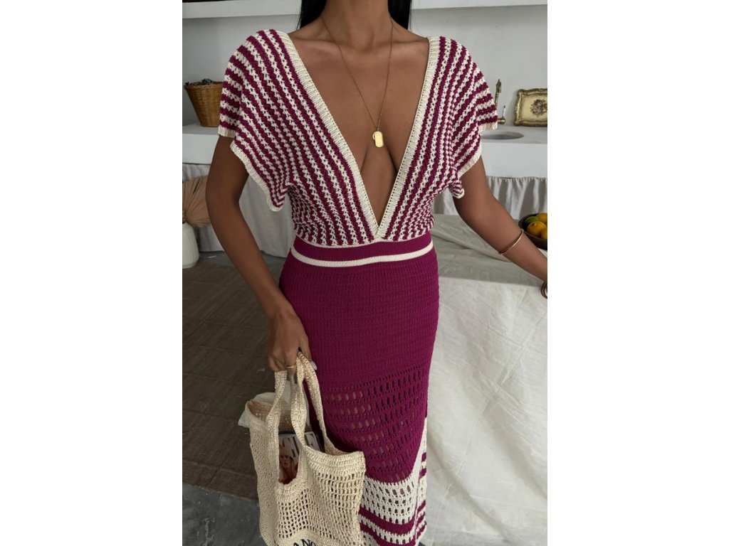 Dlhé pletené šaty s pruhmi. Kontrastná farba limetkovo zelenej. Hlboký výstrih do tvaru V. Chrbát do V. Krátke rukávy. Univerzálna veľkosť, vhodné pre postavu S, M.