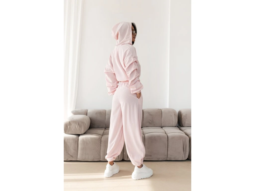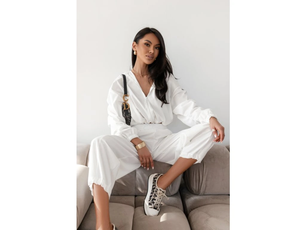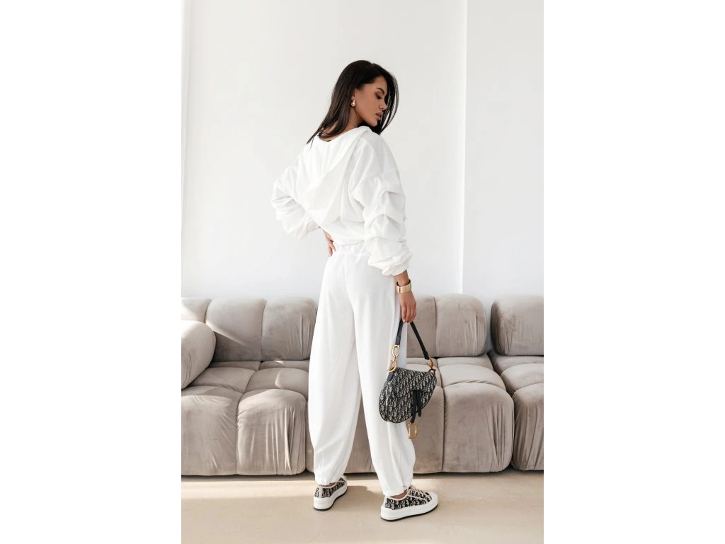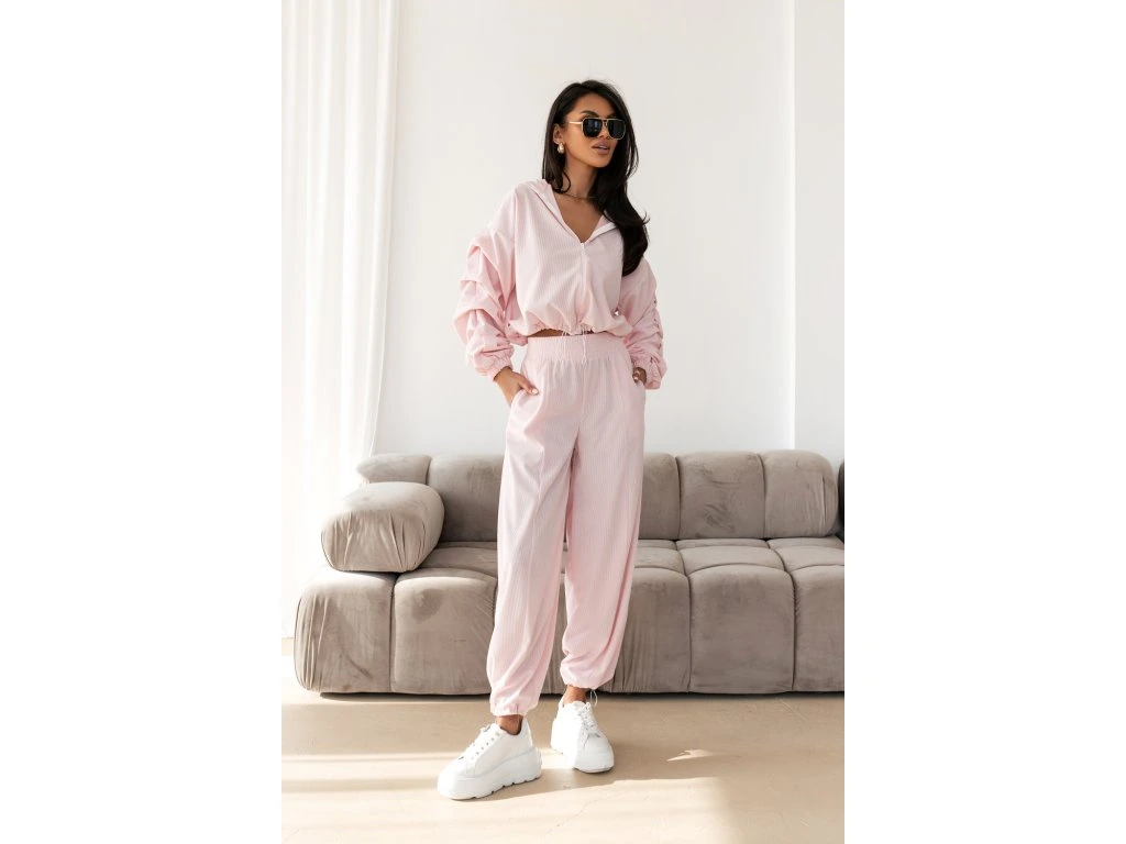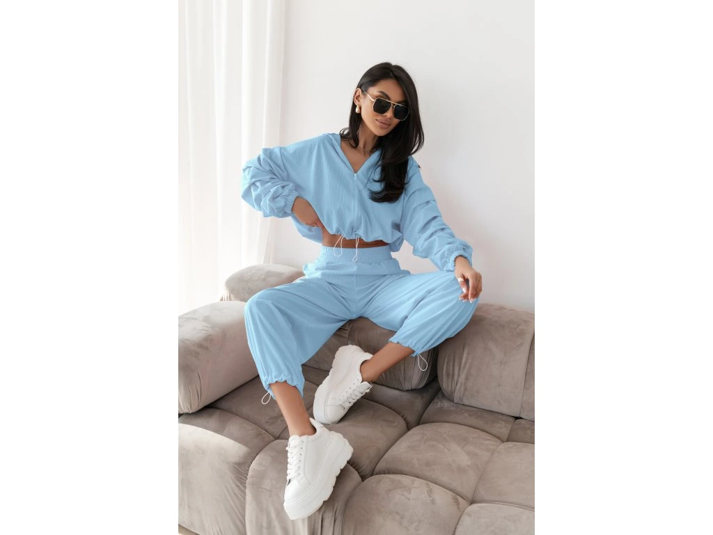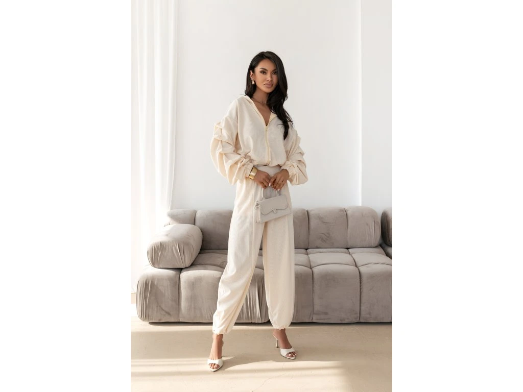 🧥 Ikonický strih mikiny: Crop strih na zips s kapucňou krásne predlžuje nohy. Dominantou sú bohato riasené balónové rukávy, ktoré dodávajú setu luxusný a neprehliadnuteľný vzhľad.